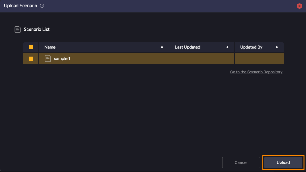 2. Upload Scenario 창에서 업로드할 시나리오 목록을 확인한 후 Upload 버튼을 클릭합니다.