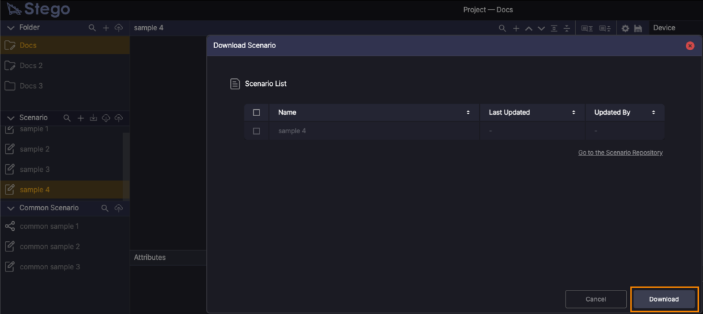 Ptero와 Stego가 연동되어 있다면 Ptero의 Scenario Repository에 저장된 시나리오를 Stego로 다운로드하여 수정할 수 있습니다.