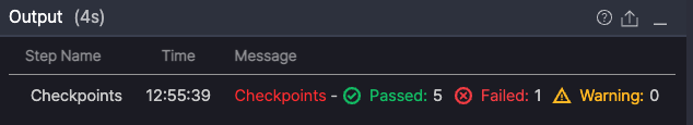 Step 5. 디바이스에서 Play Store 앱 아이콘을 삭제한 상태에서 작성한 시나리오를 실행할 경우 Output 패널에 custom message와 label이 출력됩니다.