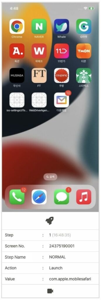 Screen 탭에서는 테스트의 각 스텝별 화면을 확인할 수 있습니다.